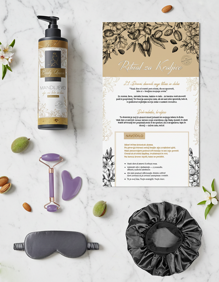 Set vključuje tudi mini dnevnik Ritual za kraljice — 21-dnevni program, ki te vsak dan povabi v 5-minutni trenutek zase. V njem najdeš kratke naloge za nego, sprostitev ali povezovanje s telesom, dnevne afirmacije in prostor za beleženje svojih majhnih napredkov. Dnevnik poskrbi, da tvoj lepotni ritual ni samo tretma za kožo, ampak tudi nežna praksa za dobro počutje in samozavest.
